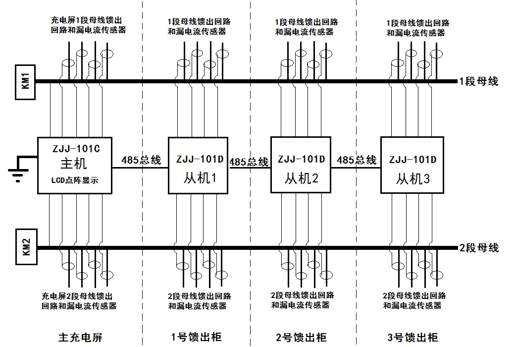 多馈出回路、多馈出柜的系统中,单主机所带检测回路数或者数量有限,或者导致屏间联线过于繁复。ZJJ-101C系统采用分布式检测,通过485串行总线连接各从机模块同步工作,使系统接线简单,工作可靠,并降低了总成本。
