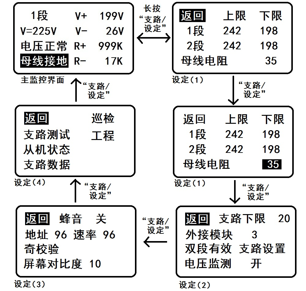 所有灰色标示的参数可以通过按“支路/设定”键依次反黑选择,然后用“上”“下”键改变数值或者进入功能。长按“支路/设定”或者选择“返回”可以返回主监测界面。